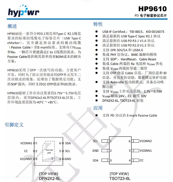 瀚昕微HP9610是一款符合PD3.1规范和Type-C R2.1规范要求的标准的线缆电子标签芯片(USB Type-C E-Marker),完全满足协议要求的被动线缆(Passive Cable)的E-mark标准。支持双口VCONN和Ra,一颗芯片就能满足C to C线缆的需求。为Passive Cable被动线缆提供极其简单的省BOM成本的解决方案。