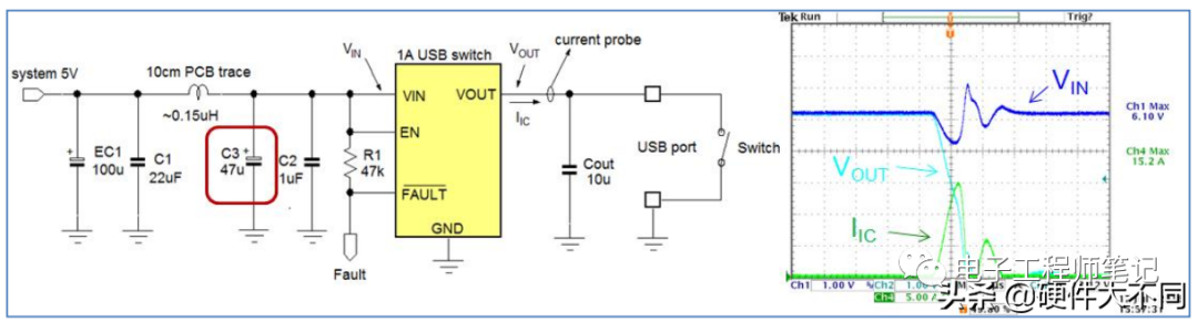 USB端口都需要进行短路测试, 这个测试通过一个开关来模拟, IC 需要在侦测到短路以后快速将其 MOSFET 开关关断。从上图中的实例可以看到, MOSFET 开关关断的动作是有延时的,因而会有一个短时大电流流过 IC 之后关断才会发生。由于输入线有电感存在,此电感和输入端去耦电容 C2 会一起发生谐振,因而可在示波器上看见输入端出现了高压脉冲,这很可能超过 IC 的最高耐压能力并将其损毁。