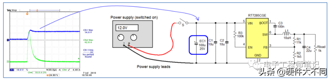 出现在系统输入端的电压振荡信号的幅度与很多因素有关:电源供应器的内阻,引线的电阻和电感量,开关 S 的电阻,输入电容 C1、 C2 的电容量和它们的 ESR 的大小。
